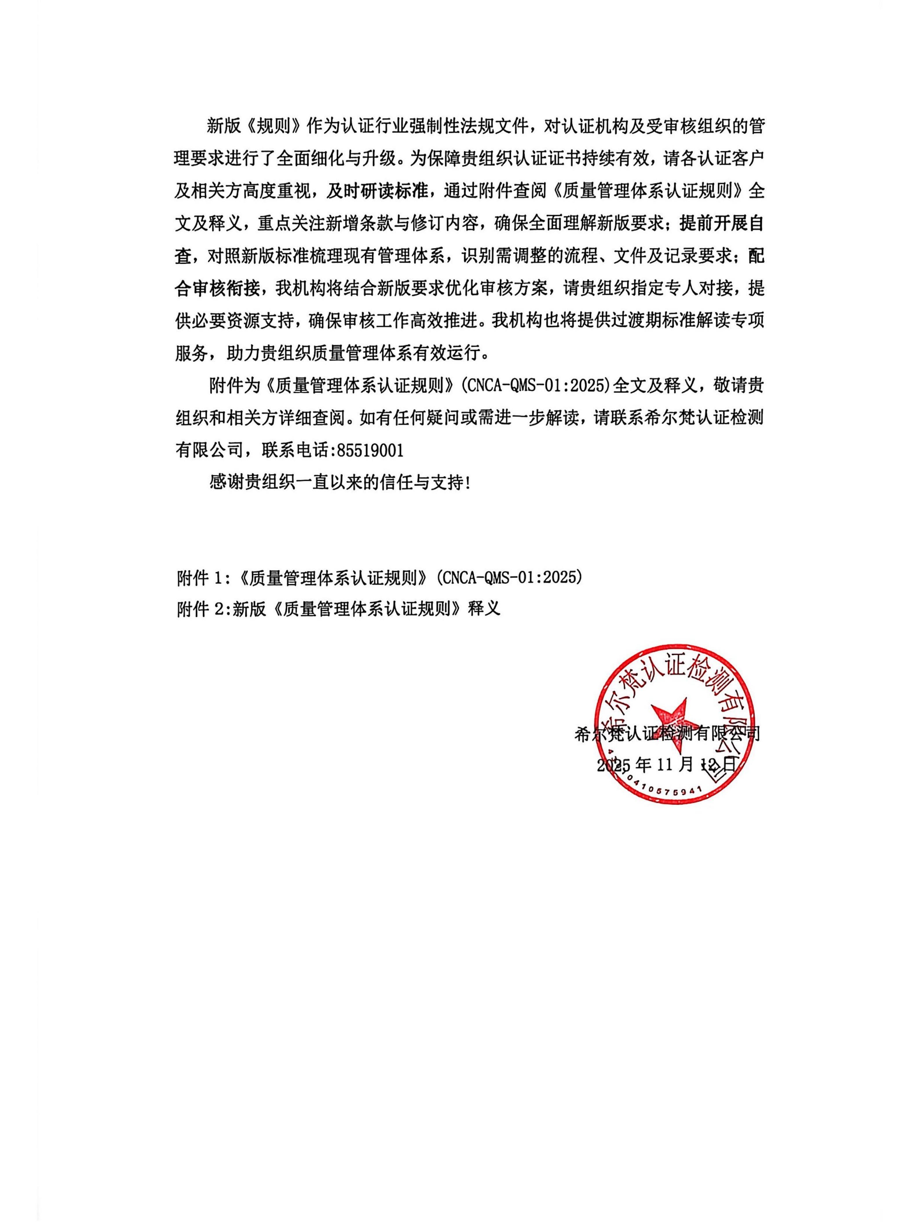 希尔梵认证检测有限公司关于“新版《质量管理体系认证规则》 ”客户告知函