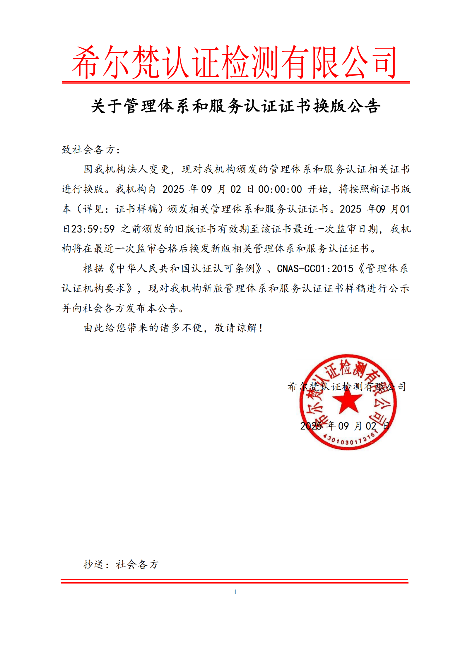 关于管理体系和服务认证证书换版公告