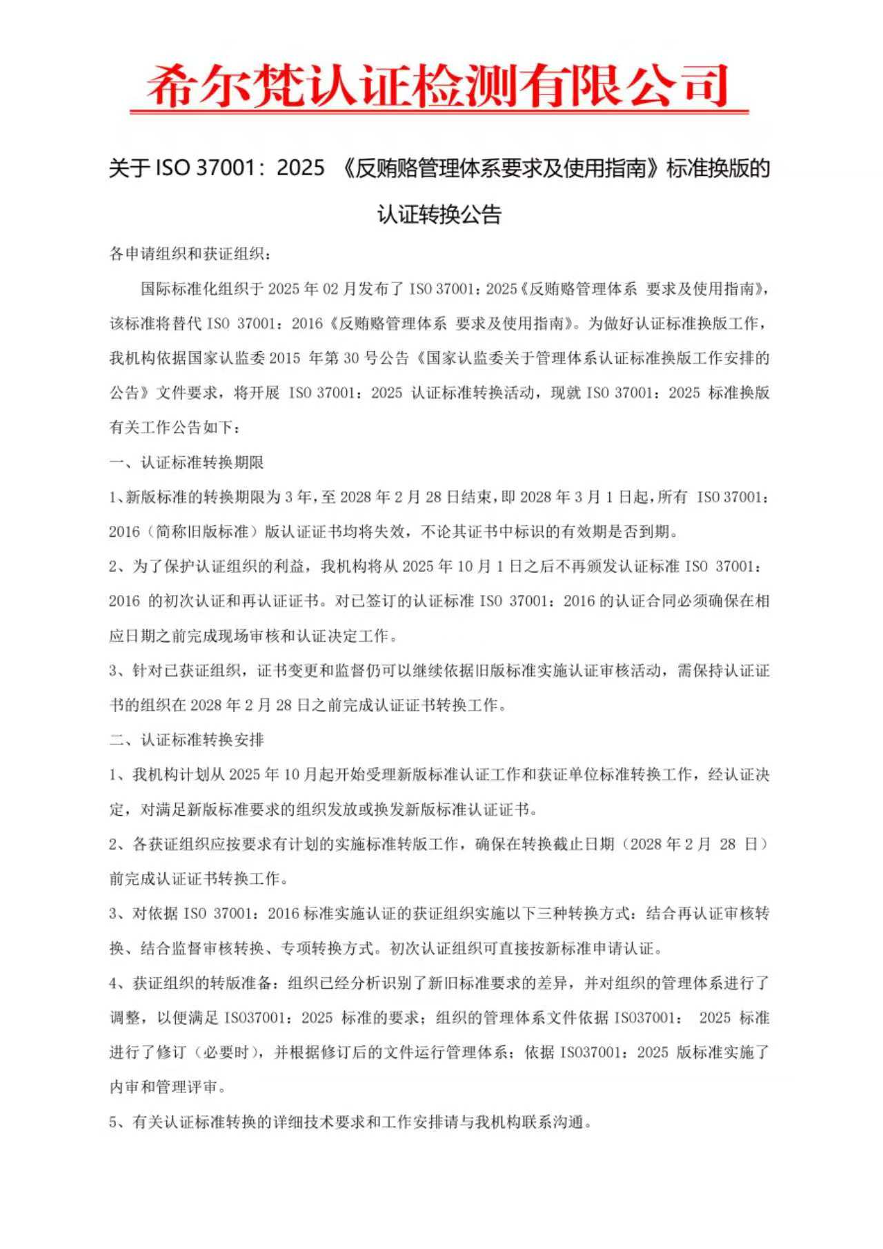 关于ISO 37001:2025反贿赂管理体系认证标准换版工作安排的公告